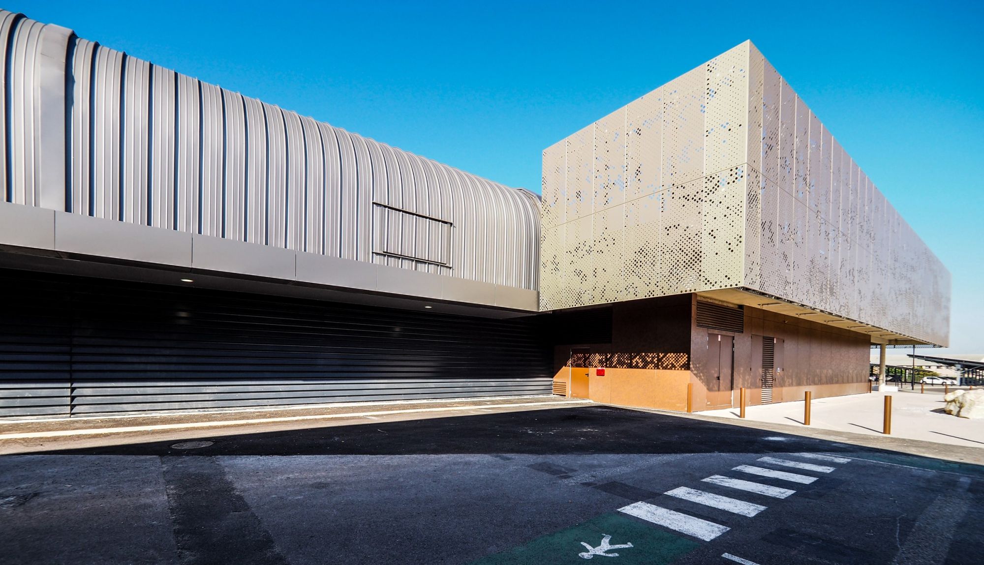 La galerie de liaisons, très largement vitrée, est conçue comme une passerelle/pont pour enjamber l’aire de manœuvre et permet de préserver de futurs travaux de l’extension.