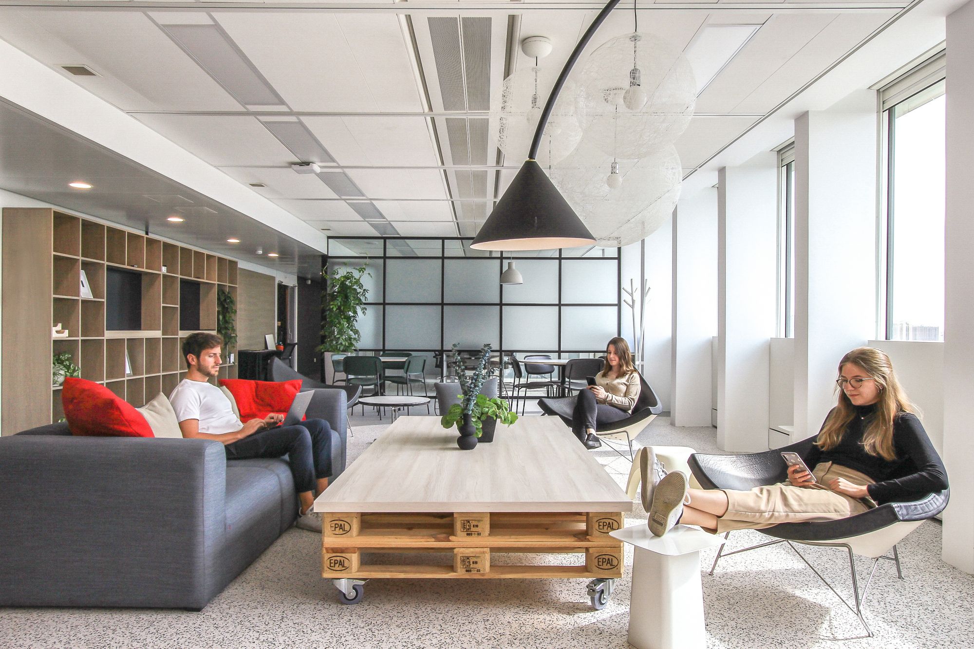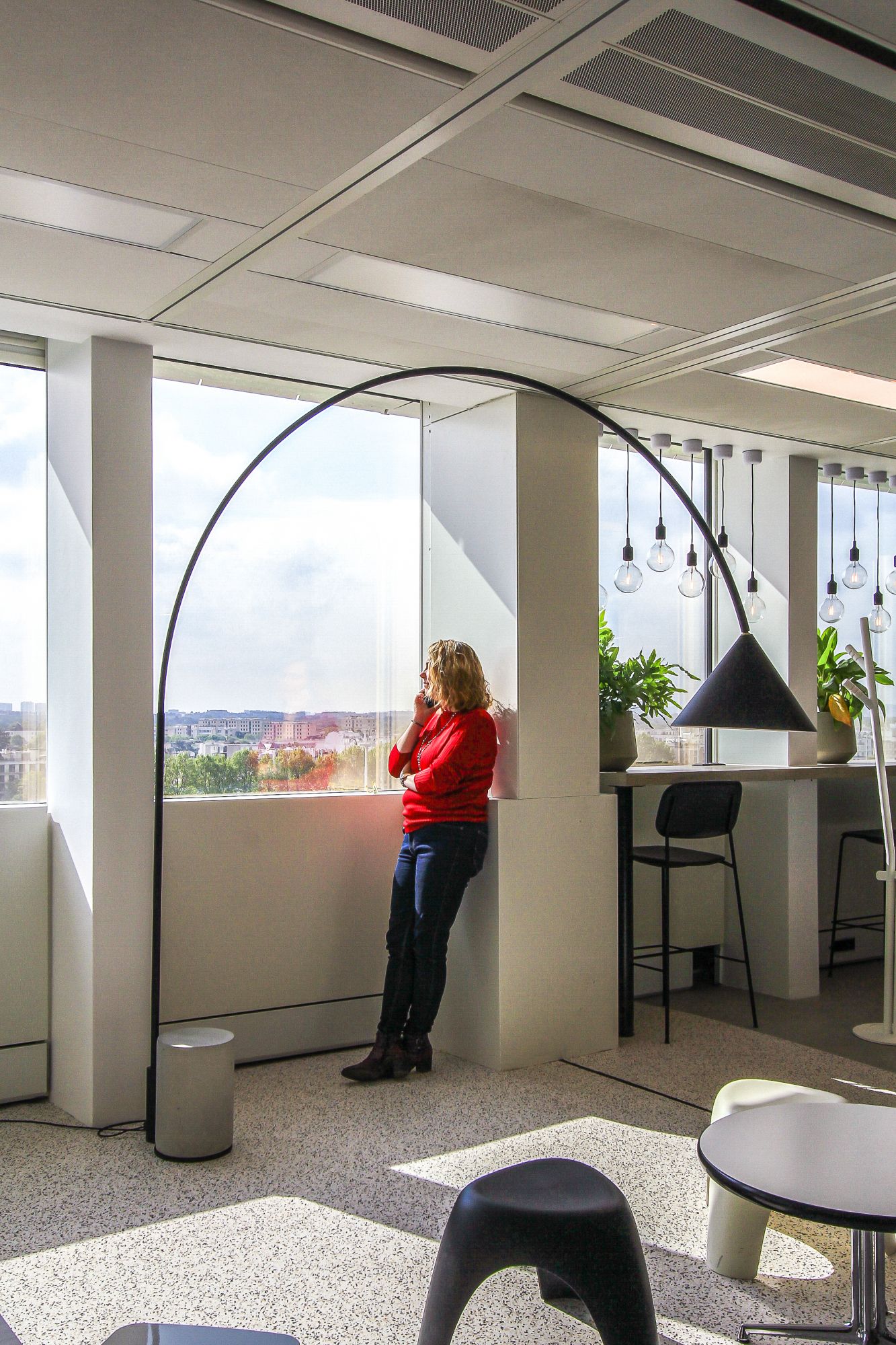 Tous les postes de travail ont été implantés en espace partagé dans le compartiment côté La Défense, recoupé par de petites salles de réunion et à proximité directe des cabines téléphoniques.