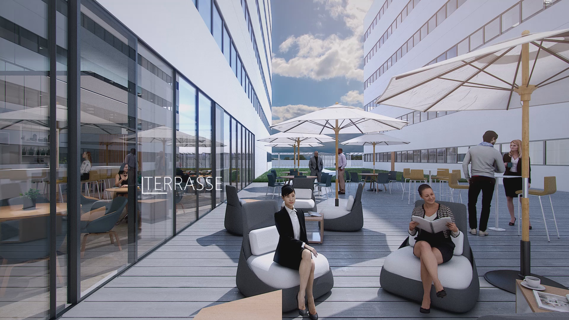 Ces deux volumes sont posés sur un socle en béton filant sur un parvis végétalisé. Ils adoptent des matériaux contemporains et s’affirment par une peau de verre de trame horizontale. Le traitement de la façade Sud est matérialisé par une résille métallique de couleur or, affirmant l’élégance des volumes par des jeux de reflets qui se transforment au grès du temps et des saisons. Cette façade donnant sur le parvis constitue « une vitrine » visible et identifiable depuis l’entrée du site.