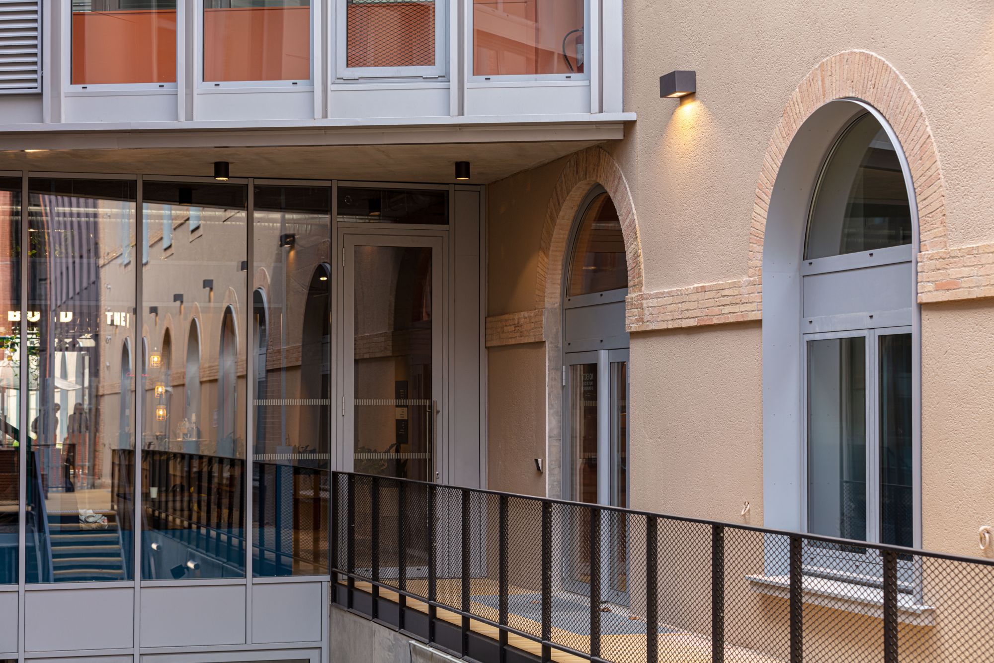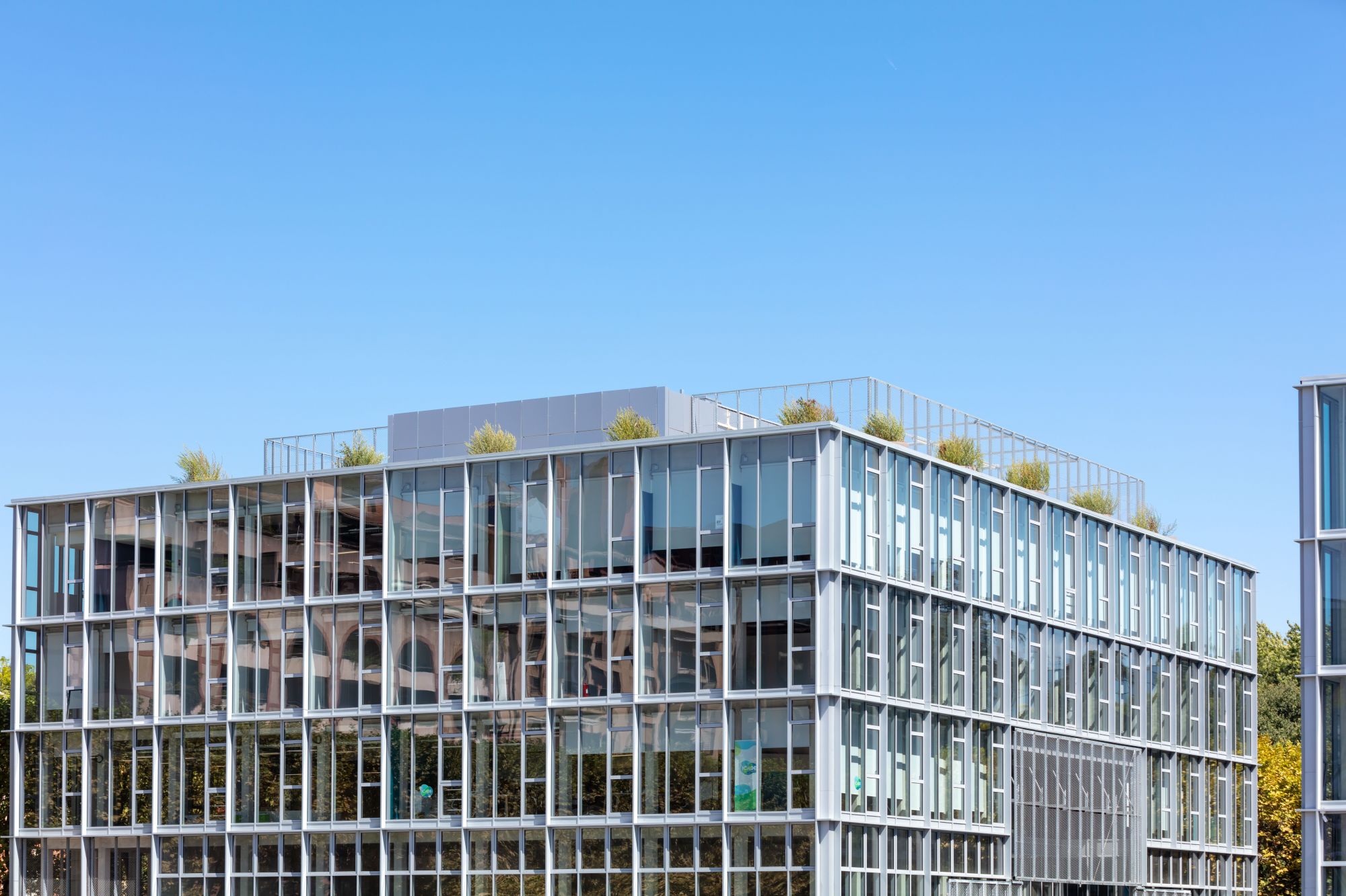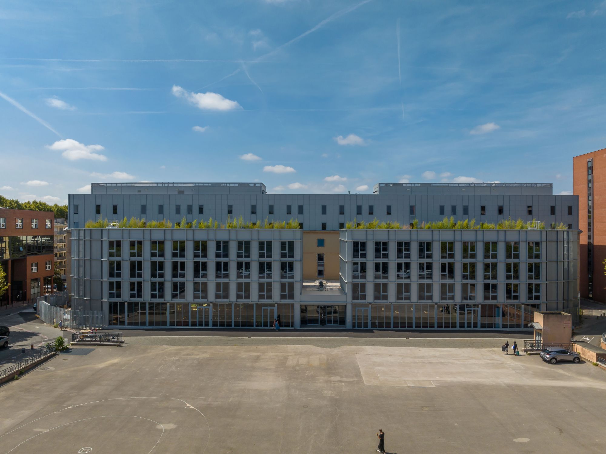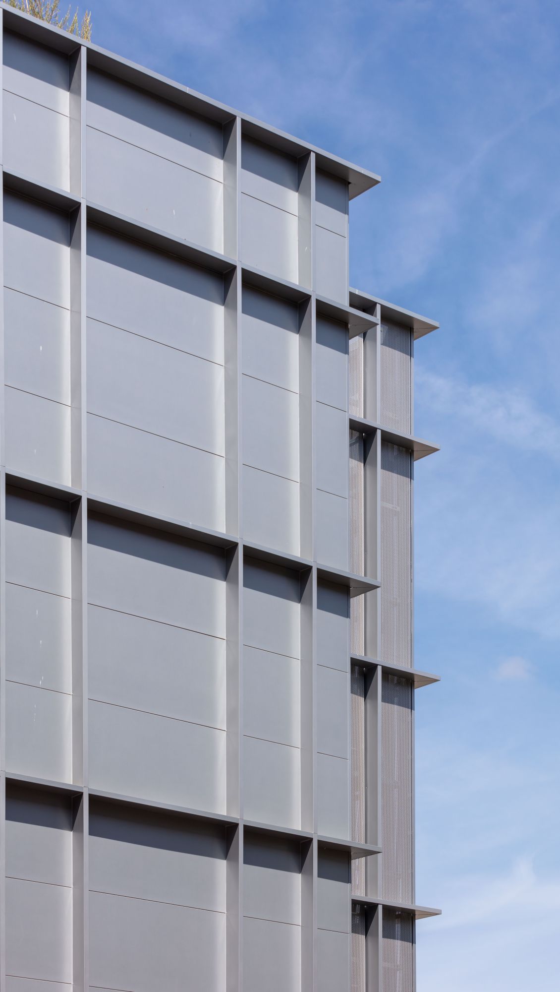 - Le verre : Afin de mettre en valeur et de ne pas saturer le paysage, la transparence du verre compose l’ensemble des façades des plots de l’Ecole et de celui du coworking. C’est volontairement une écriture légère et transparente qui est recherchée afin de valoriser l’activité de formation aux métiers du numérique et inversement tourner le bâtiment vers cet espace public très qualitatif.