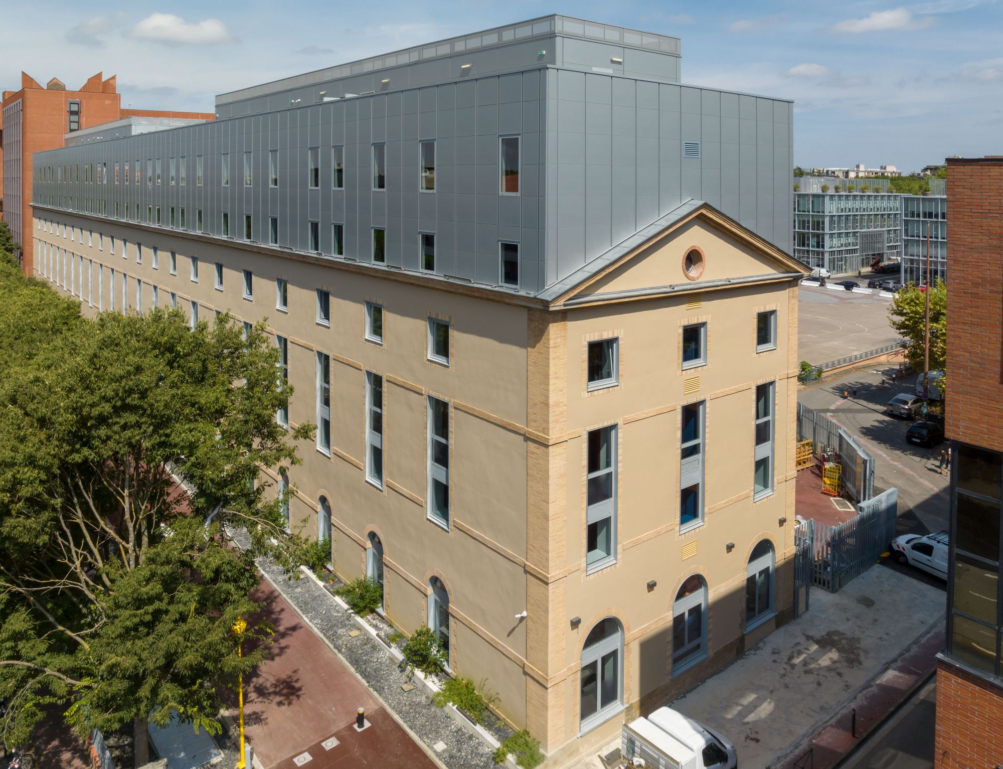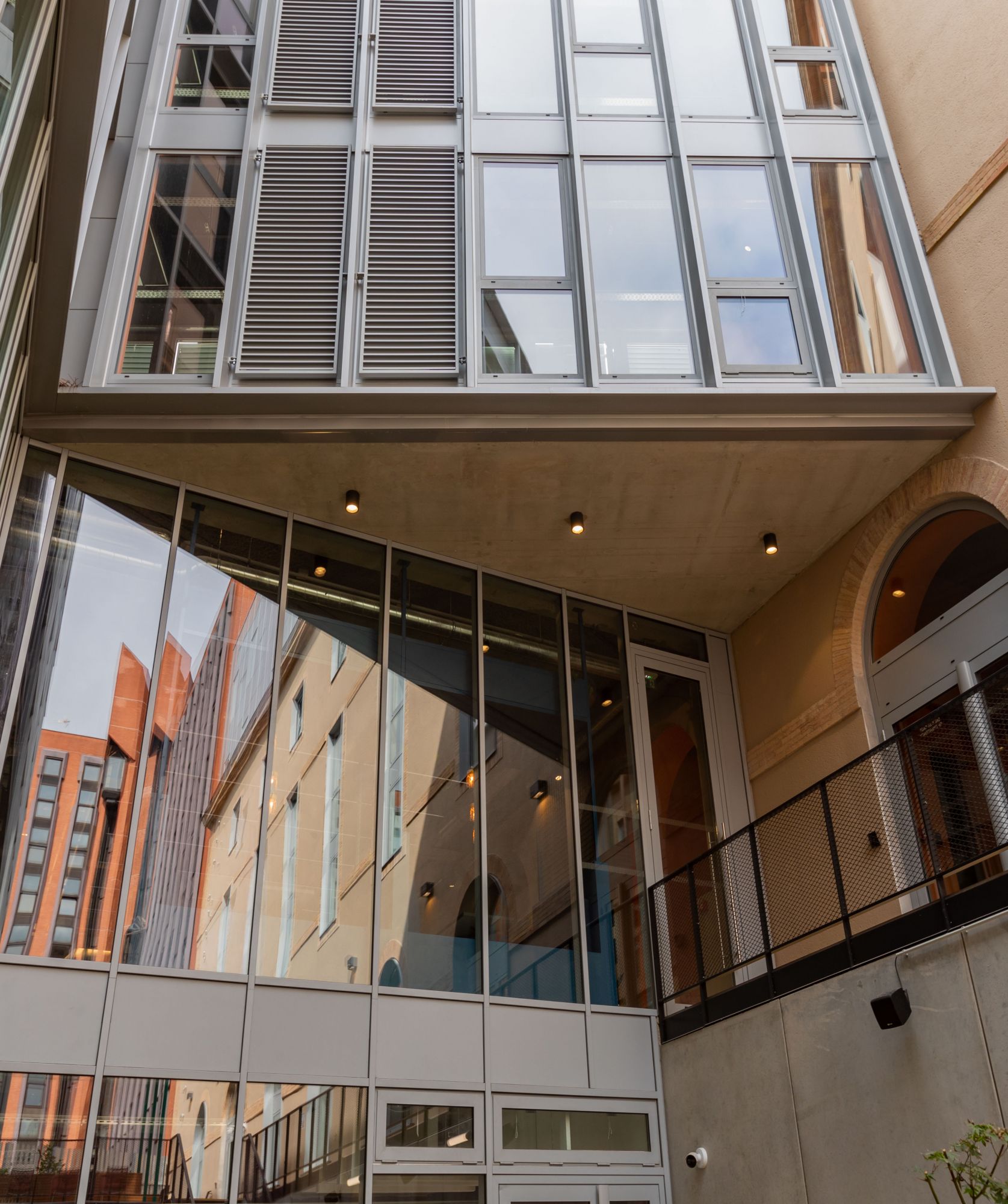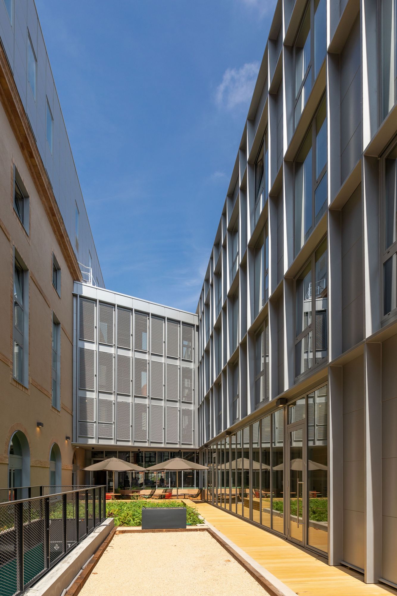 Deux plots indépendants, accueillant l’école et le co-work, font miroir à cette réhabilitation en vis-à-vis du parvis paysagé, affirmant la transition entre architecture classique et modernité. Cette proposition est un ambitieux projet de densification urbaine en respectant l'enjeu primordial du confort de vie. C'est dans ce cadre qu'est conçu le projet du Campus Numérique ; Ynov vient ici renforcer les synergies déjà existantes entre différents acteurs de la vie économique et des universités telles que la TBS, Epitech, ...