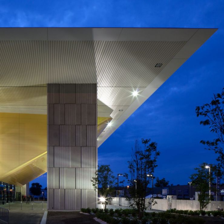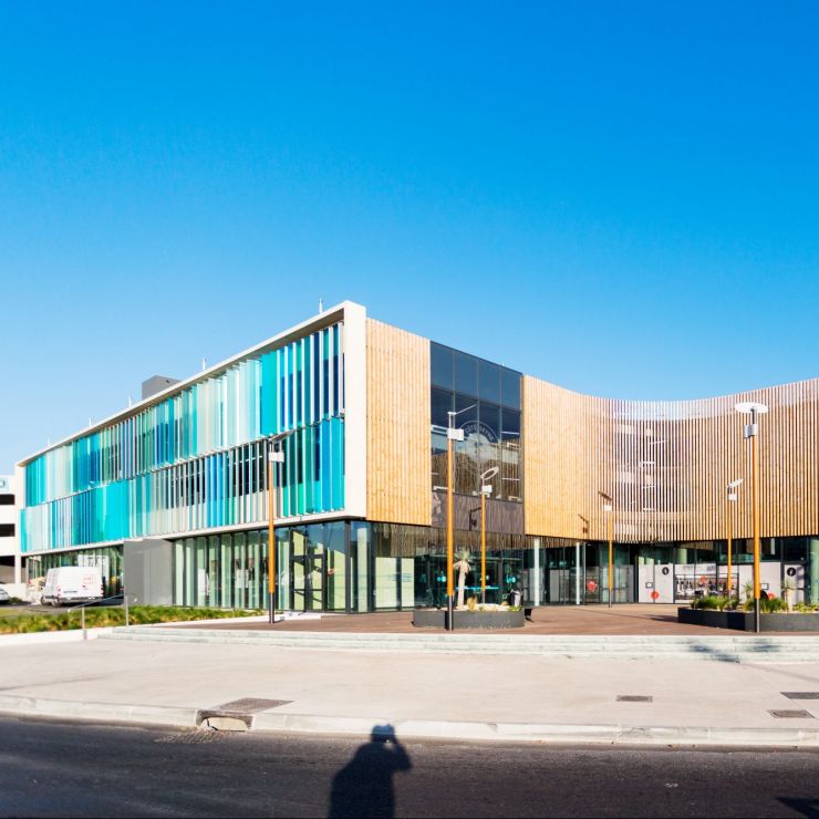 Il se pare d’une façade en verre sérigraphié aux reflets rouges et d’argenture, une interprétation contemporaine de la brique accentuant l’impact de cette balise urbaine.