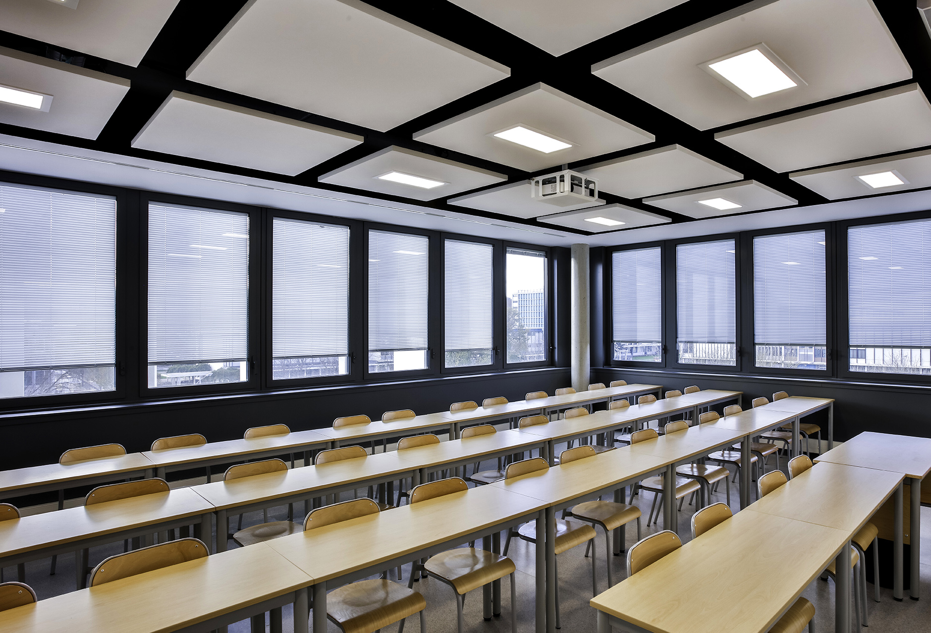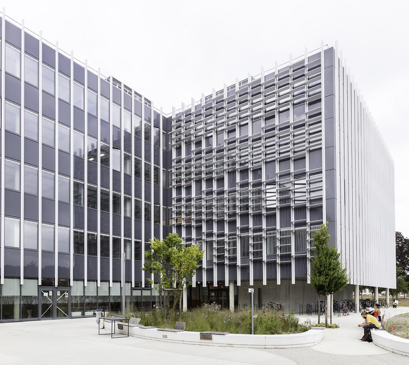 Bien campée à l’épicentre de l’Université, elle instaure le dialogue avec le campus et les mitoyens. Point d’entrée unique des nouveaux entrants sur l’accompagnement pédagogique et l’auto-formation, elle accueille 3 360 personnes dont 2 980 étudiants. Son architecture parachève l’ilot, assigne au sol son pouvoir unitaire et fédérateur. Tel un tapis gansé par les limites des trottoirs, le sol accueille le parc habité, frais, ombragé, minéral et végétal et l’impose comme espace public.