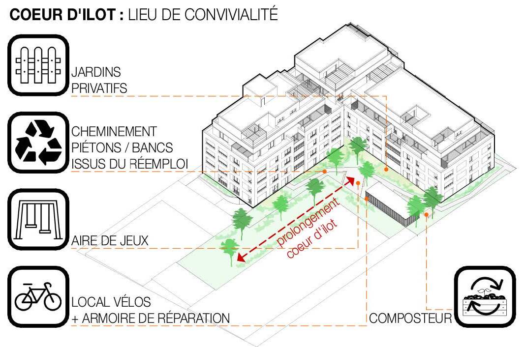 Les 60 logements s’organisent autour d’une partie centrale en cœur d’ilot dans une recherche de sociabilité. Cette centralité est pensée comme un véritable lieu commun partagé, favorisant les rencontres entre voisins et enfants. Il se développe le long d’un cheminement piéton reliant les halls.