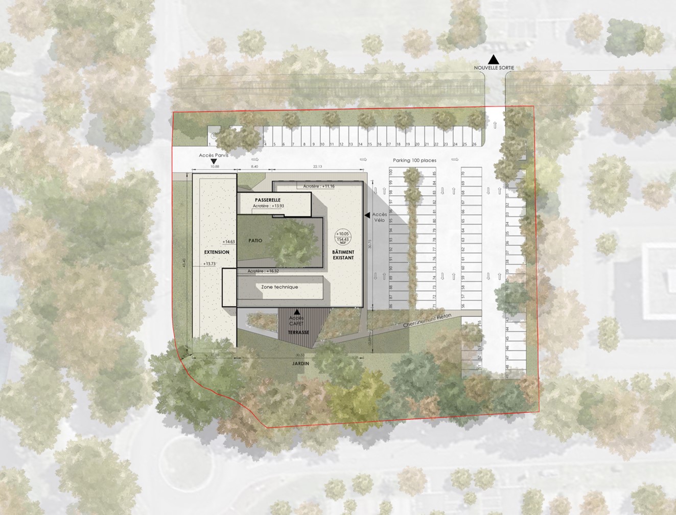 Nous avons pensé le nouveau bâtiment, comme un tout avec un lien de parenté avec le bâtiment existant mais développant sa personnalité propre. L’extension est visible et parfaitement identifiable depuis la rue et l’entrée du site.