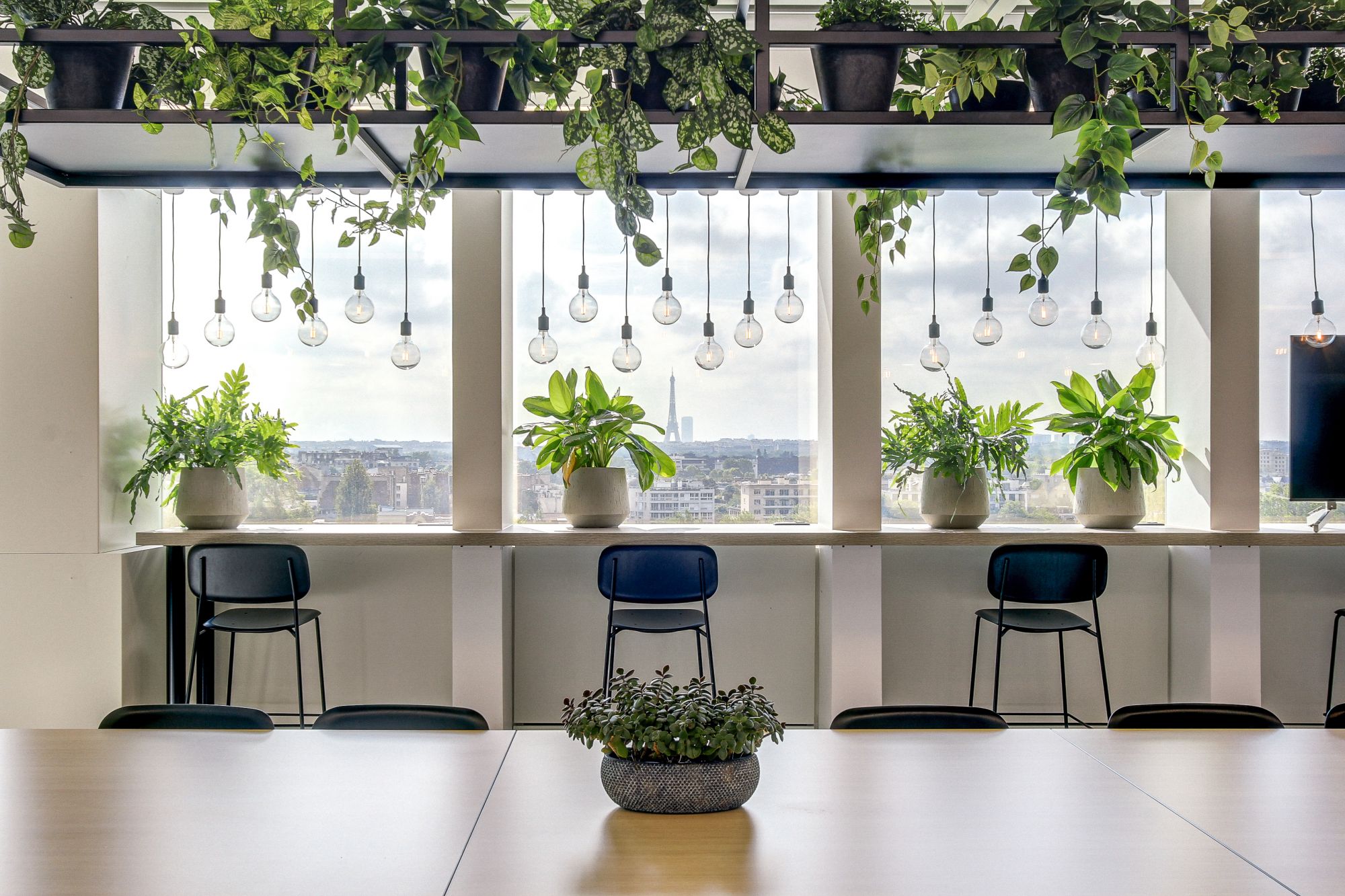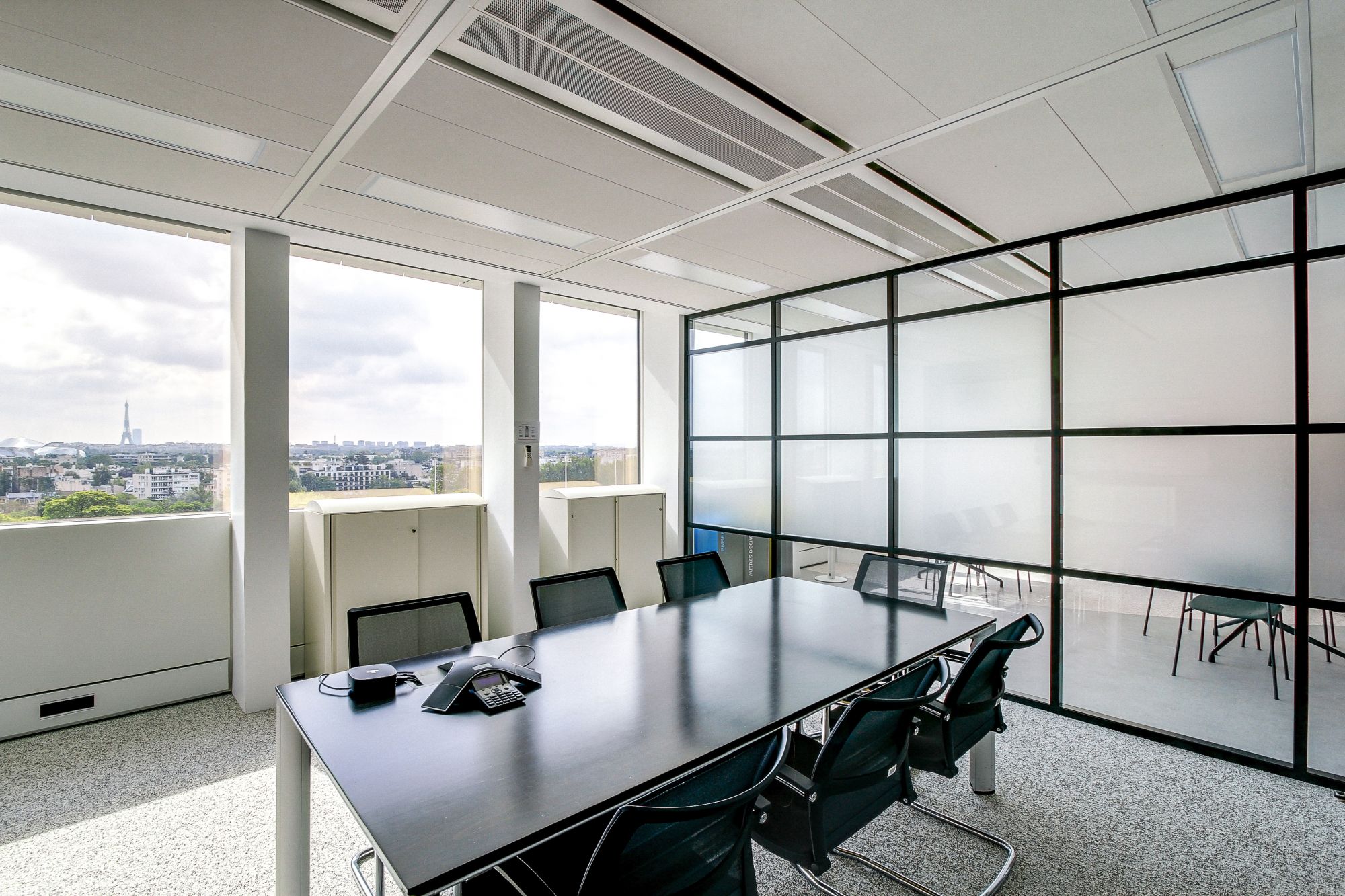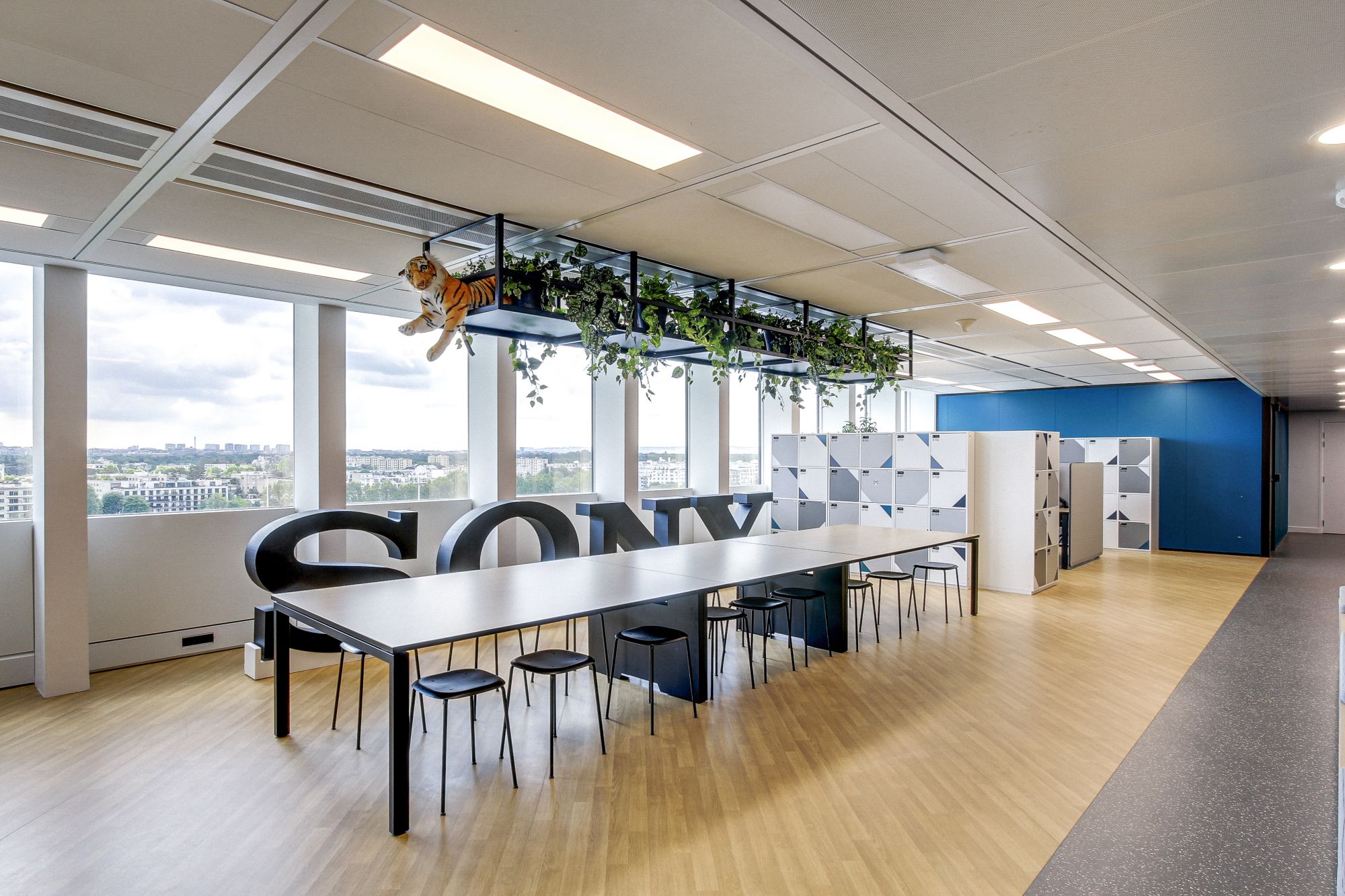 Tous les postes de travail ont été implantés en espace partagé dans le compartiment côté La Défense, recoupé par de petites salles de réunion et à proximité directe des cabines téléphoniques.