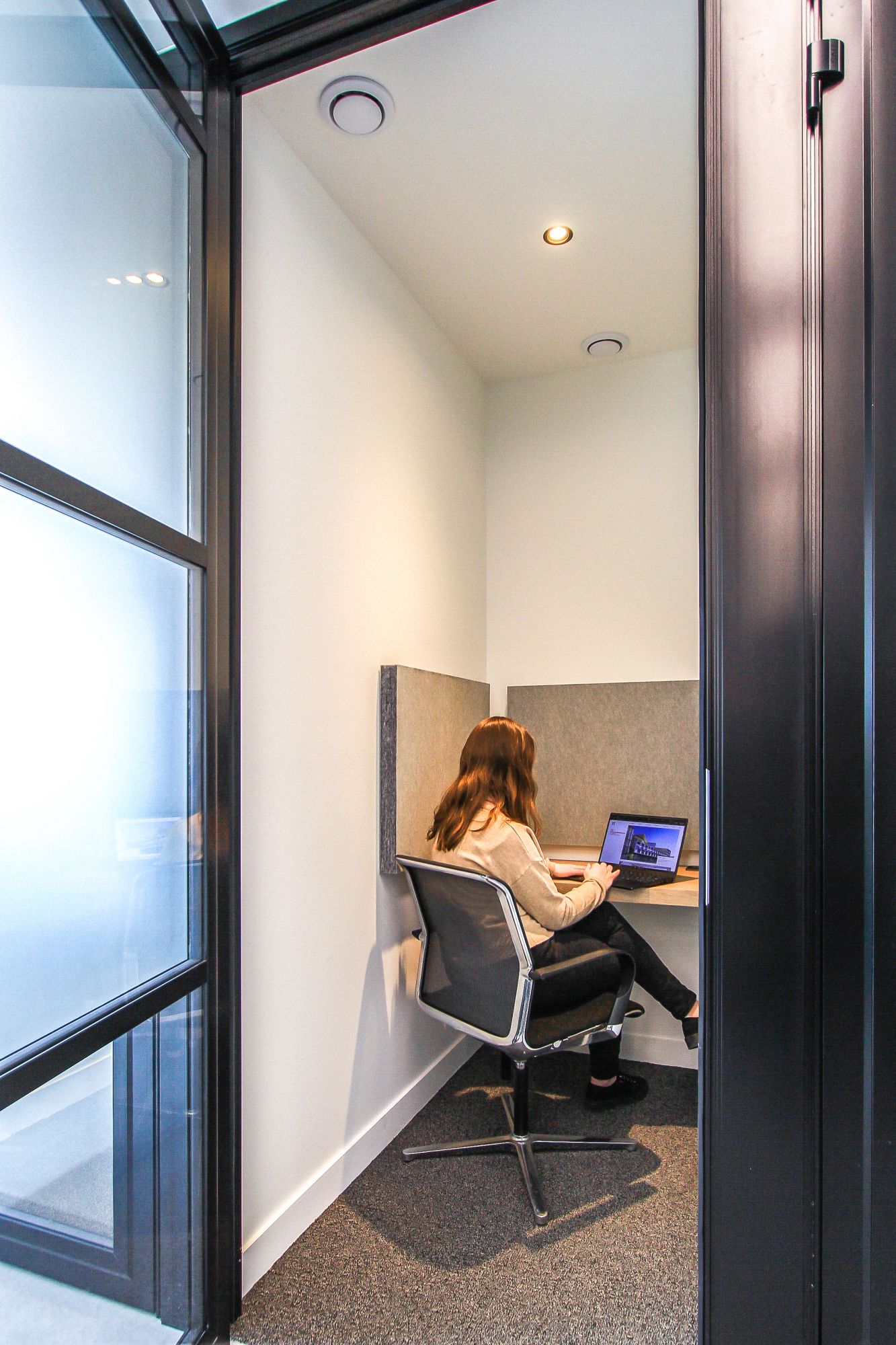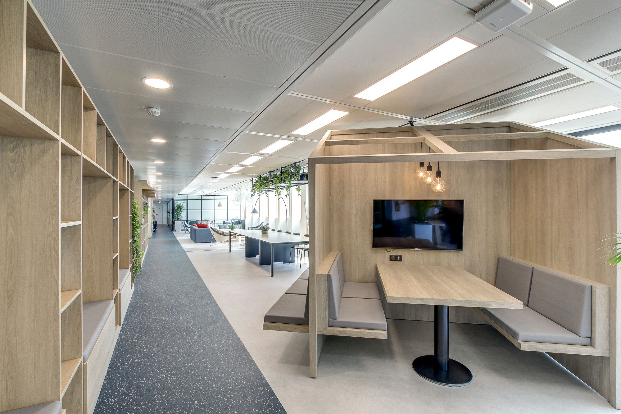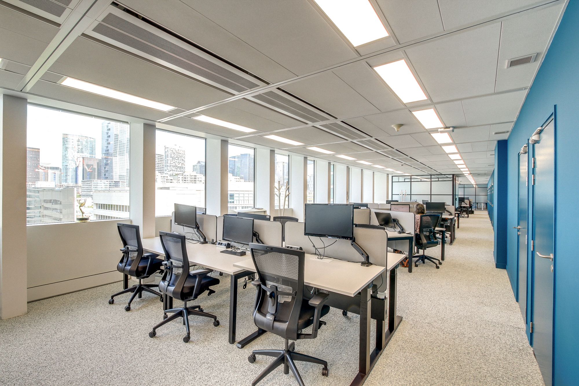 Tous les postes de travail ont été implantés en espace partagé dans le compartiment côté La Défense, recoupé par de petites salles de réunion et à proximité directe des cabines téléphoniques.
