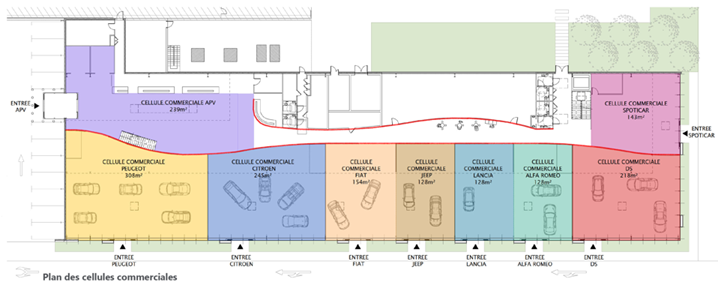 - Galerie centrale : colonne vertébrale du projet, reliant les différents espaces par des courbes créant des respirations et incitant à la découverte des showrooms.